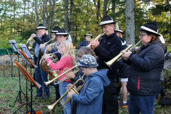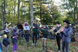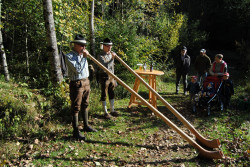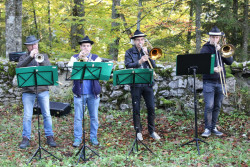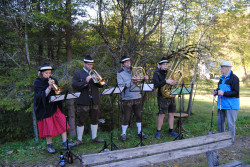 Musiwandertag. Die fleißigen Wanderer wurden beim Musiheim willkommen geheißen. Von dort führte die Route über den Festplatz und den Hinterbergteich hinauf zur Ruine. Entlang des Weges spielten an mehreren Stationen Kleingruppen, um die musikalische Vielfalt des Vereins zu präsentieren. So konnte man beispielsweise Klänge von Klarinetten, Trompeten, Saxophonen und sogar Alphörnern durch den Wald hören. Quartette, Almmusik oder Brassband – für jeden war etwas dabei. Ebenso konnten auf der Strecke historische Fotos von Hohenberg bewundert werden.